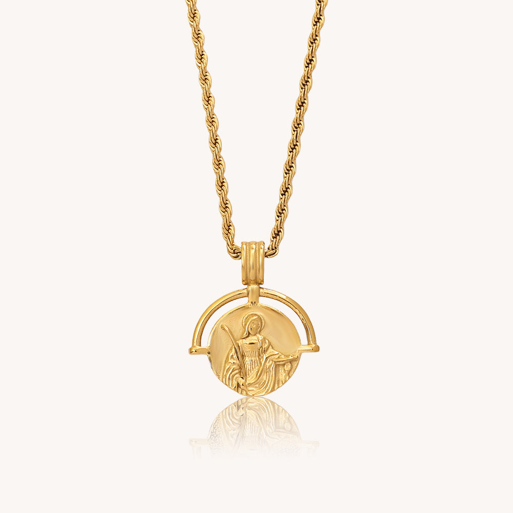 The Keels Necklace is Inspired by ancient iconography and this design features a gold-plated coin depicting the Patron Saint of Sicily, Saint Agatha and on the otherside, a celestial sky from one of our favourite counties, Derry.